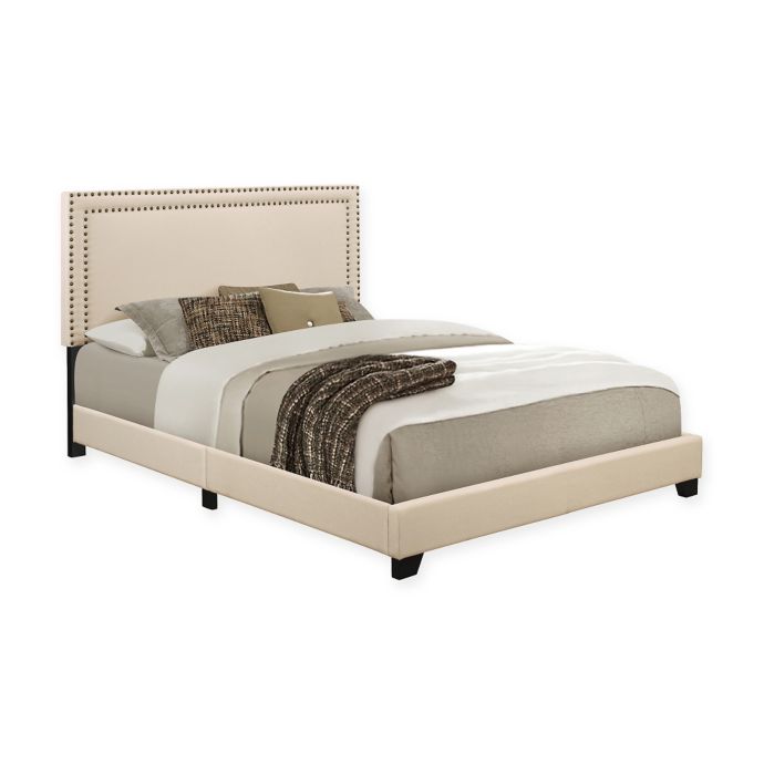 Bring refined elegance to you bedroom with this streamlined upholstered headboard the squared shape features one row of polished nickel finished nail head trim that highlights its clean silhouette. This upholstered king bed set will bring instant elegance and a touch of glamour to your bedroom. It's ornate shape is accented with nickel finished nail head trim for a glamourous, traditional style. Pulaski tufted nailhead trimmed linen beige, 85.50 l x 80.50 w x 52.00 h upholstered king bed This is an updated version of a classic design.